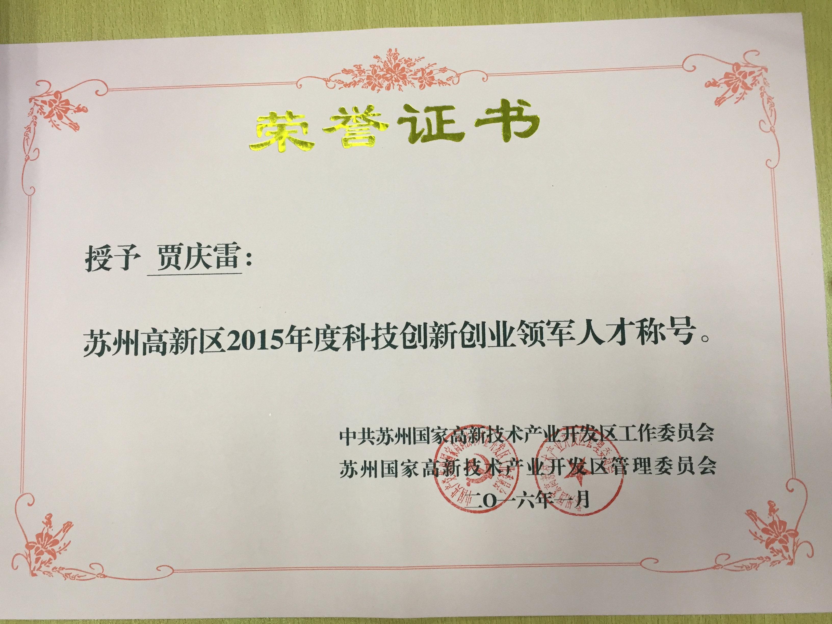 蘇州高新區(qū)2015年度科技創(chuàng)新創(chuàng)業(yè)領(lǐng)軍人才稱號