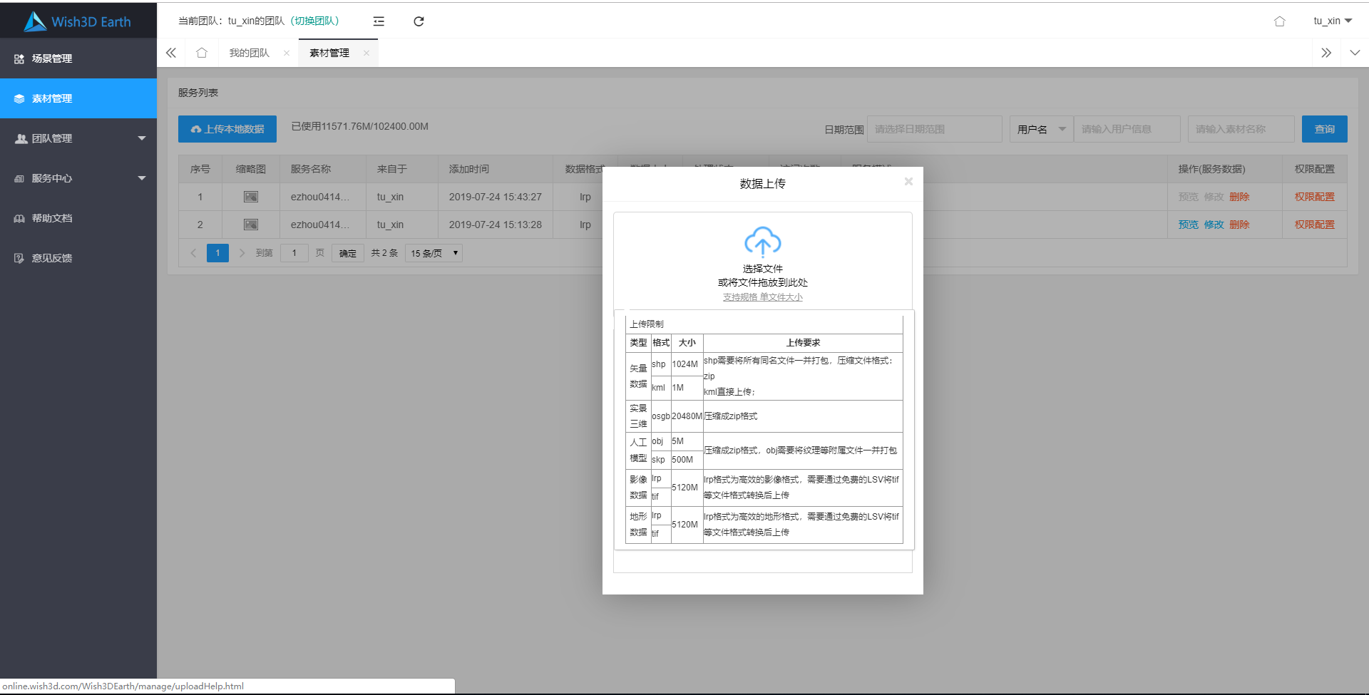 点击上传本地数据,打开上传面板,根据格式体积要求,点击选择、或拖拽文件上传素材。根据上传要求上传相应的数据。