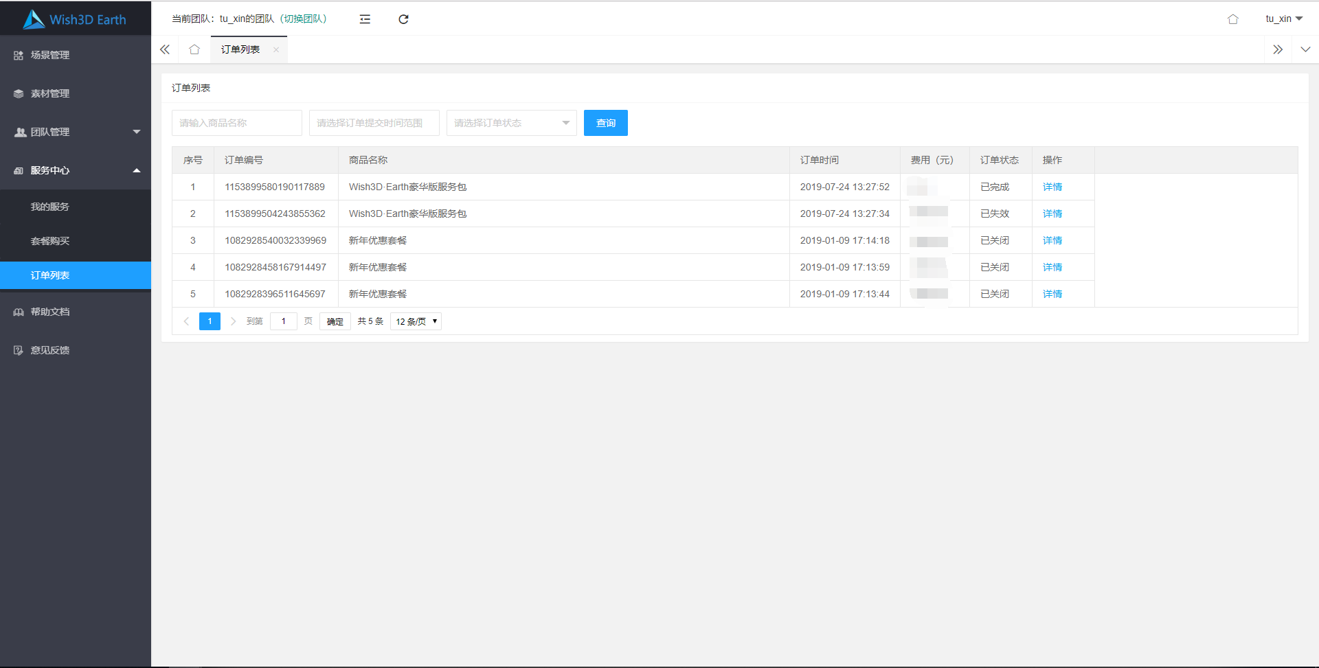 点击“订单列表”菜单,进入订单列表界面,可以看到我购买过的订单。