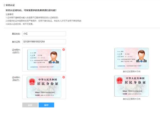 点击实名认证菜单,进入实名认证界面。输入您的真实姓名以及身份证号,上传身份证正反面照片。点击保存,申请成功,等待审核。