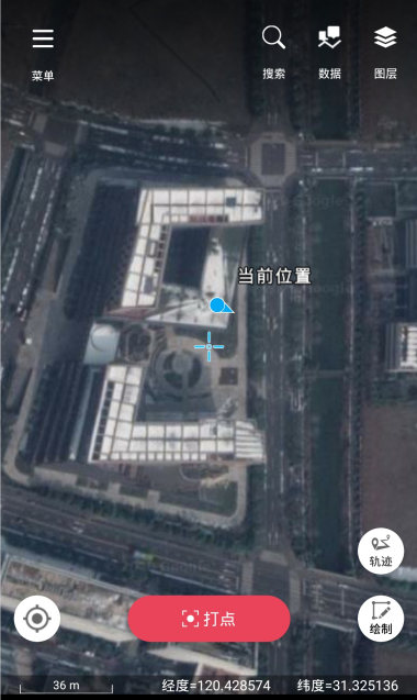 主界面主要包括以下内容:顶部按钮、右侧栏、定位按钮、打点按钮、比例尺、坐标显示。