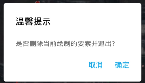 退出绘制模式:点击后,如果有添加的节点,会弹出“是否删除当前绘制的要素并退出”弹框,点击确定后退出绘制模式并清空绘制的节点信息,点击取消则弹框消失。如果没有添加的节点则直接退出绘制模式。
