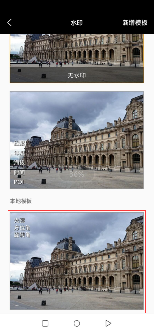 水印模板选择页面:点击右下方水印图标即可跳转至水印模板选择页面。