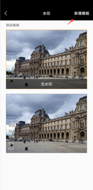 水印模板选择页面包含:水印模板选择、新增模板、模板编辑等功能