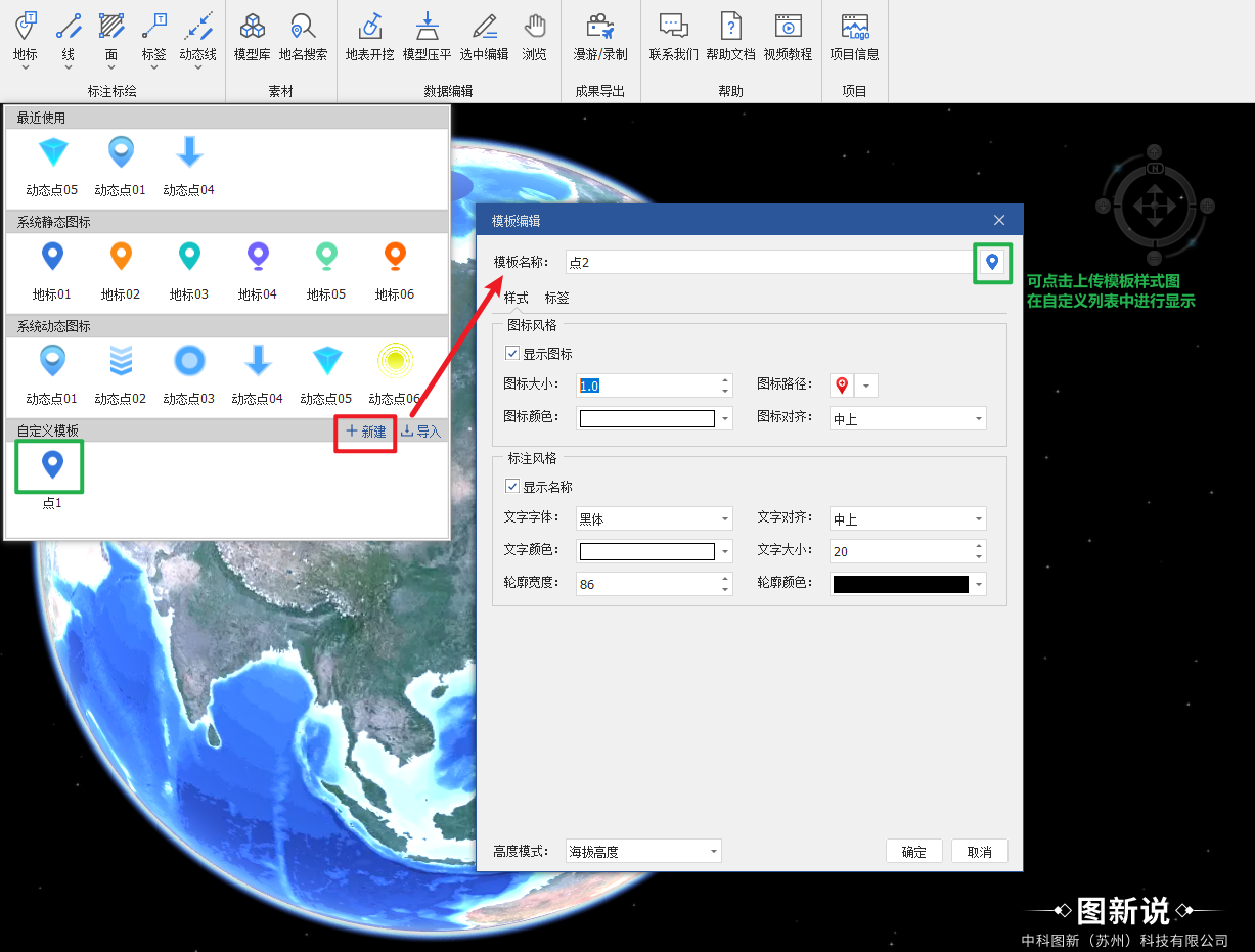 图新说支持创建要素(点、标签、线、动态线、面)模板进行标绘统一风格内容。