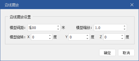 模型间距:默认按照绘制的线长度给出合理间距和模型个数,可通过输入数值和按上下按钮进行调整,场景中会根据调整值实时进行更新。