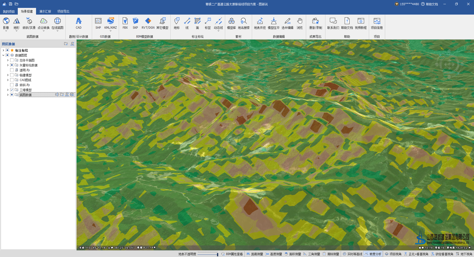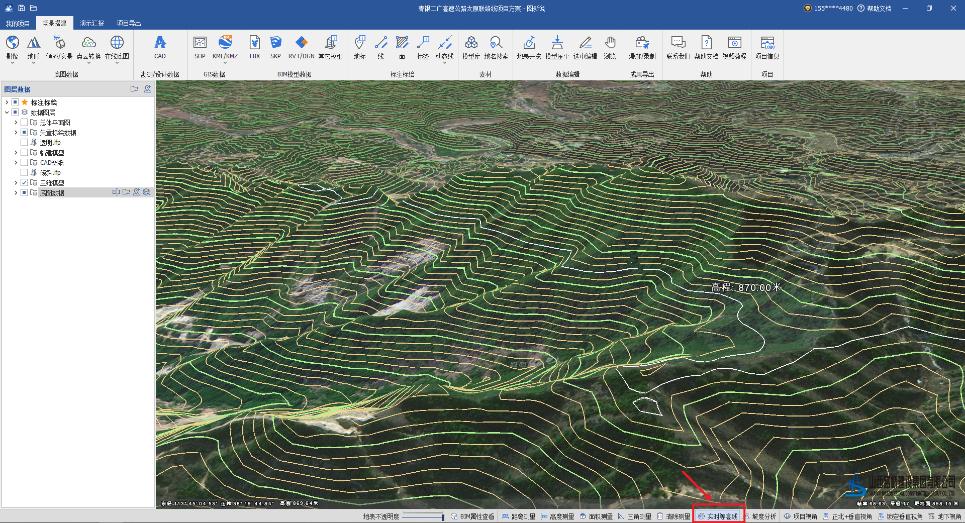 点击“实时等高线”,一键开启场景内加载地形的实时动态等高线,等高线的分布状况也可以显示出地形变化的陡峭和平缓。鼠标悬浮在等高线上,可以查看高程值,单位为米。